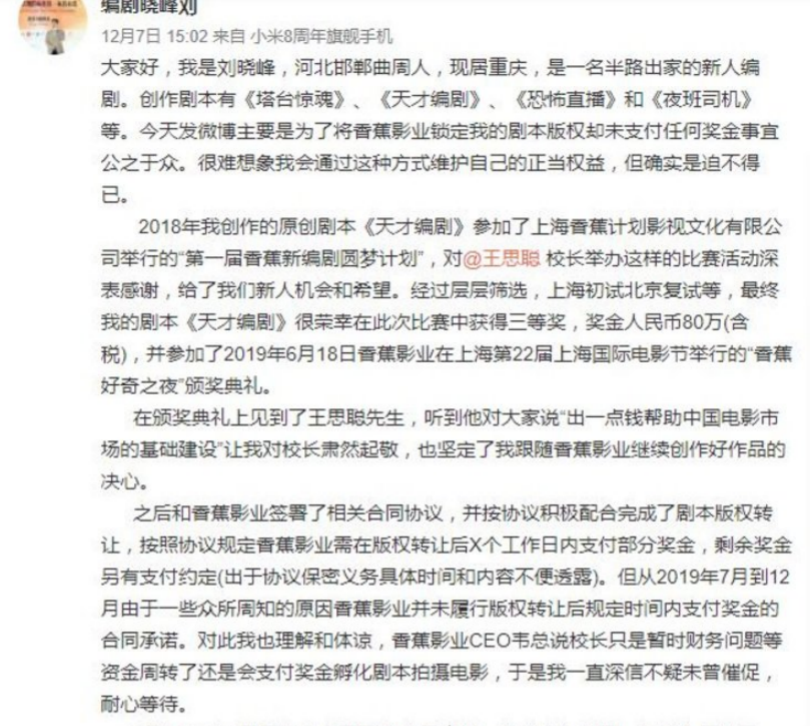 2021年1月,王思聰退出上海香蕉計(jì)劃電子游戲的公司股東及監(jiān)事,緊接著,香蕉游戲傳媒也被英雄體育VSPN收購(gòu)。香蕉影業(yè)甚至遭到了編劇劉曉峰的公開討薪,在微博公開發(fā)文稱自己被王思聰?shù)南憬队皹I(yè)拖欠80萬(wàn)元版權(quán)費(fèi)。