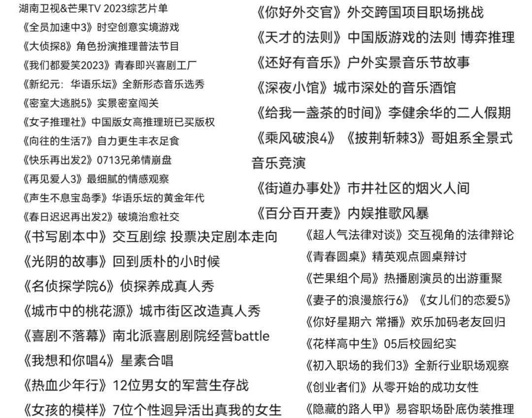 市場(chǎng)表現(xiàn)是行業(yè)生產(chǎn)的“晴雨表”,最近有一份網(wǎng)傳的湖南衛(wèi)視&芒果TV冬季招商會(huì)新綜片單在微博上被熱議,暴露了群眾對(duì)于爆款綜藝的迫切需求。倘若2022注定被失望填滿,2023能否成為國綜起勢(shì)的轉(zhuǎn)折之年呢?