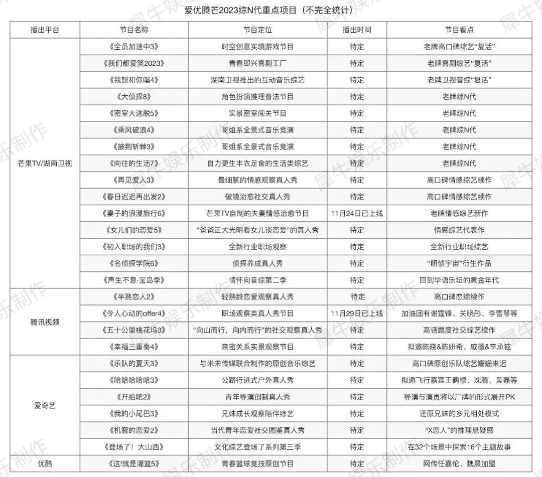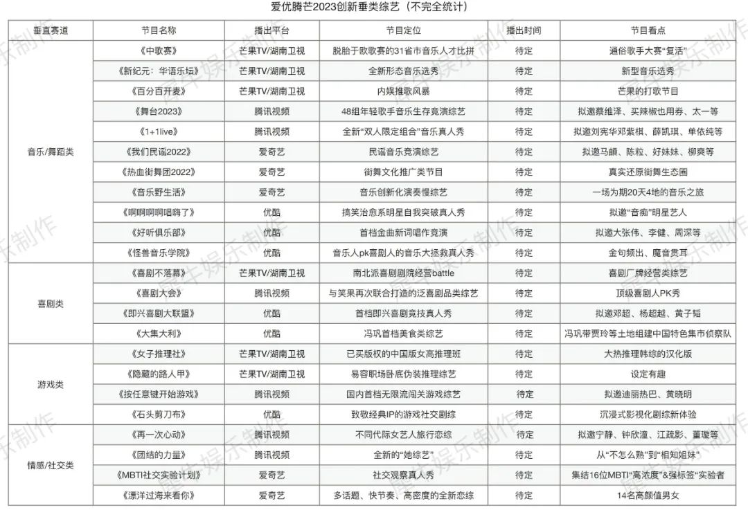 結(jié)合這份網(wǎng)傳片單,以及不久前騰訊綜藝招商會(huì)、愛奇藝2022-23快樂專列和優(yōu)酷云賞會(huì)透露出的相關(guān)片單,犀牛君梳理了各平臺(tái)值得關(guān)注的2023新綜項(xiàng)目(以及延播的部分2022綜藝項(xiàng)目)。2023的國綜市場(chǎng)能否等來“救市主”,我們一同來拆解。