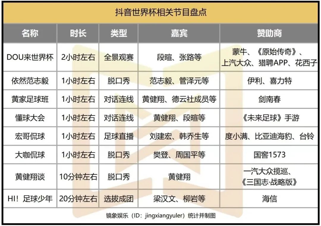 此次世界杯相關(guān)綜藝中,央視上線了《天下足球》《足球盛宴10》《我愛(ài)世界杯》《大咖陪看球》等一眾新老節(jié)目,咪咕視頻和抖音也雙雙發(fā)力。抖音上線了包括《DOU來(lái)世界杯》《依然范志毅》《黃家足球班》《懂球大會(huì)》在內(nèi)的8檔節(jié)目,而咪咕視頻則推出了《搖滾足球濛友局》《濛主來(lái)了之我的眼睛就是尺》《世界杯最強(qiáng)音》等13檔節(jié)目。