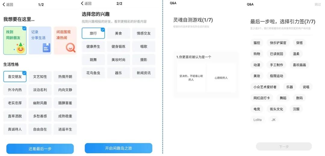 再比如,選擇興趣愛好時,閑趣島提供的選項(xiàng)是中規(guī)中矩的“器樂”“健康養(yǎng)生”“花鳥魚蟲”……而Soul上用的則是“貓控”“已讀就回”“網(wǎng)紅店打卡”“街頭文化”等具有明顯年輕人特性的描述。