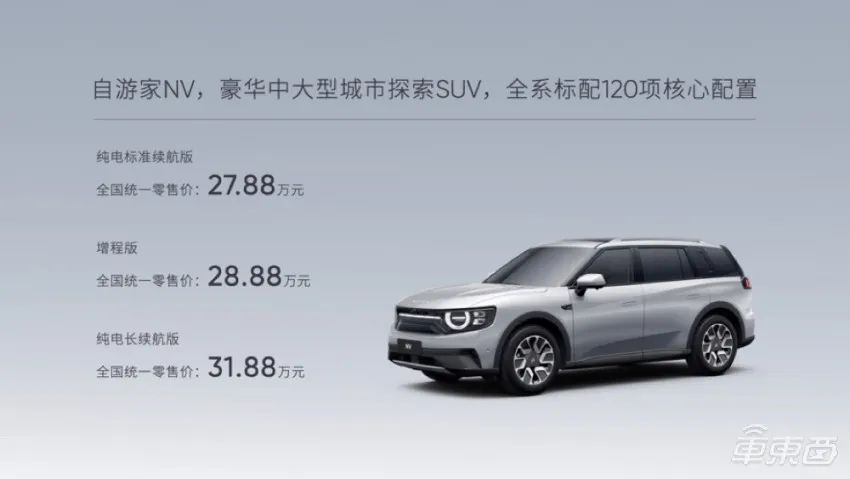 而在今年國慶節(jié)后的第一天,自游家NV終于迎來了上市,共分為純電和增程兩個版本。