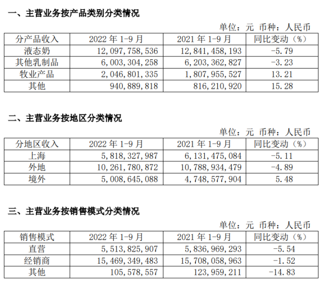 三季度財(cái)報(bào)顯示,2022年1-9月,光明液態(tài)奶板塊收入約120.98億元,同比下降5.79%;其他乳制品收入60.03億元,同比下降3.23%;只有牧業(yè)產(chǎn)品收入20.47億元,同比增長(zhǎng)13.21%。