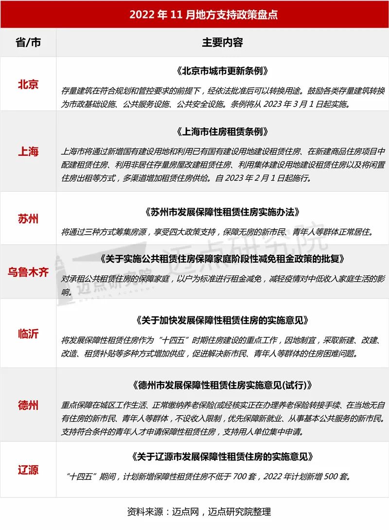 11月,地方政府進一步完善了住房保障體系。在市場培育方面,北京鼓勵各類存量建筑轉(zhuǎn)換為公共設(shè)施,作為第一批城市更新試點城市,該政策受到市場的廣泛關(guān)注。上海、蘇州、臨沂等市進一步加大保租房的籌集力度,鼓勵盤活存量用地。另外,烏魯木齊和德州進一步發(fā)揮保障房對中低收入家庭和新市民、青年人群體的保障作用,有利于推動住房保障體系高質(zhì)量發(fā)展。
