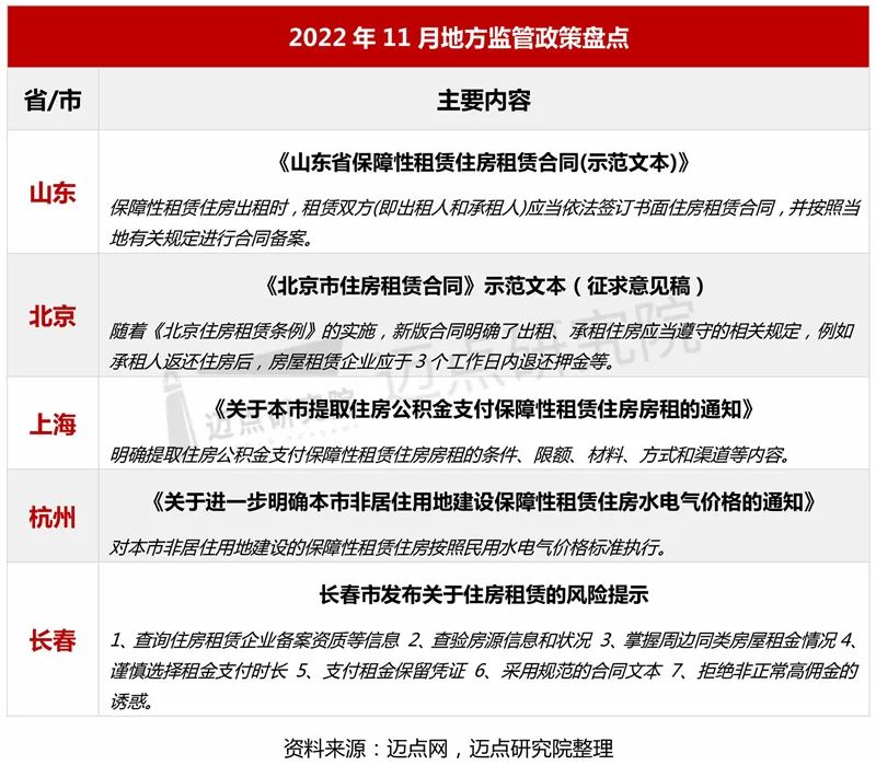 11月,地方政府市場監(jiān)管方面細化了政策細則,進一步規(guī)范市場秩序。山東和北京推出了住房租賃合同范本,規(guī)范了合同簽訂問題;長春發(fā)布住房租賃風(fēng)險提示,提高租客的風(fēng)險意識;另外,上海細化了公積金支付保租房房租的具體內(nèi)容,杭州發(fā)布保租房水電氣價格標準,有利于有效降低非居住用地建設(shè)保障性租賃住房的企業(yè)運營成本,減輕新市民、青年人租房成本。