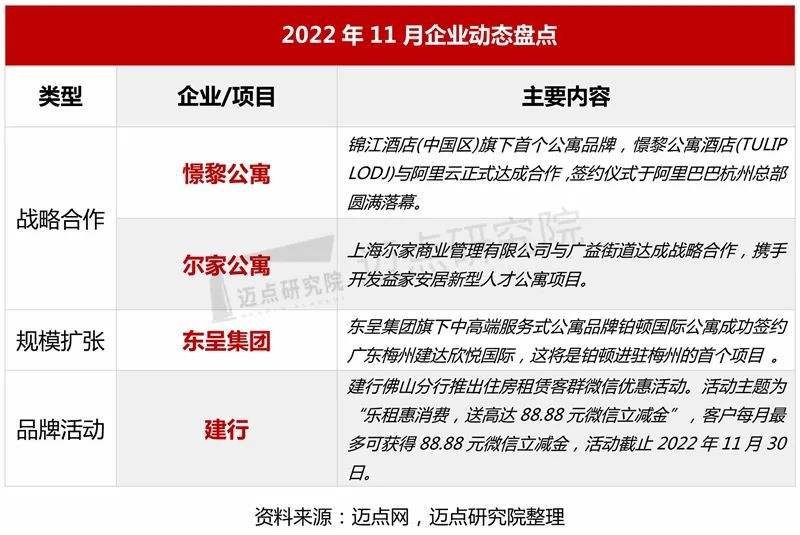 戰(zhàn)略合作方面,住房租賃企業(yè)戰(zhàn)略合作加速,在產(chǎn)品的智能化方面進一步發(fā)展。錦江酒店(中國區(qū))旗下首個公寓品牌,憬黎公寓酒店(TULIP LODJ)與阿里云正式達成合作。憬黎公寓將在產(chǎn)品打造上,植入阿里云智慧公寓系統(tǒng),為服務(wù)精細化錦上添花。另外,爾家與廣益街道達成戰(zhàn)略合作,攜手開發(fā)益家安居新型人才公寓項目。