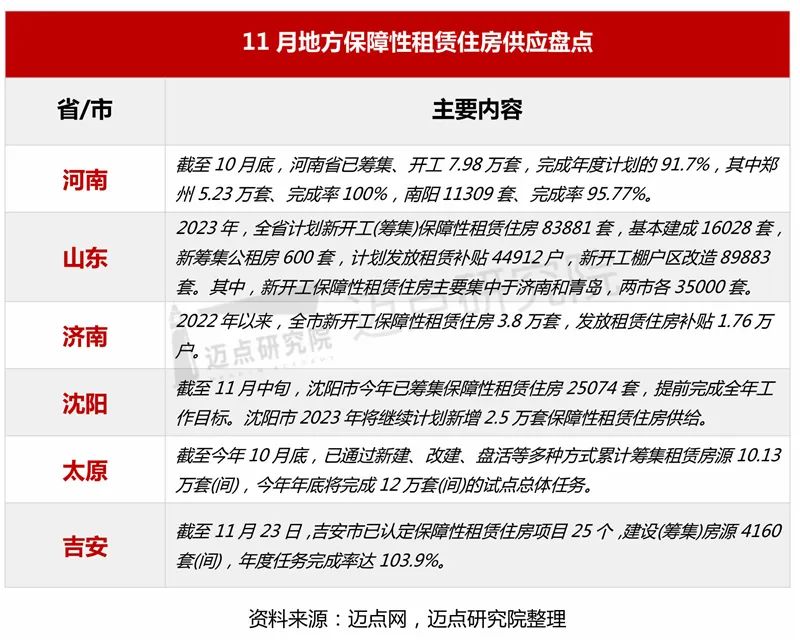 11月,河南、山東、濟南、沈陽、太原、吉安等省市繼續(xù)公布保障性租賃住房的籌集進度和供應(yīng)計劃。其中,沈陽和吉安已提前完成年度保租房籌集目標。