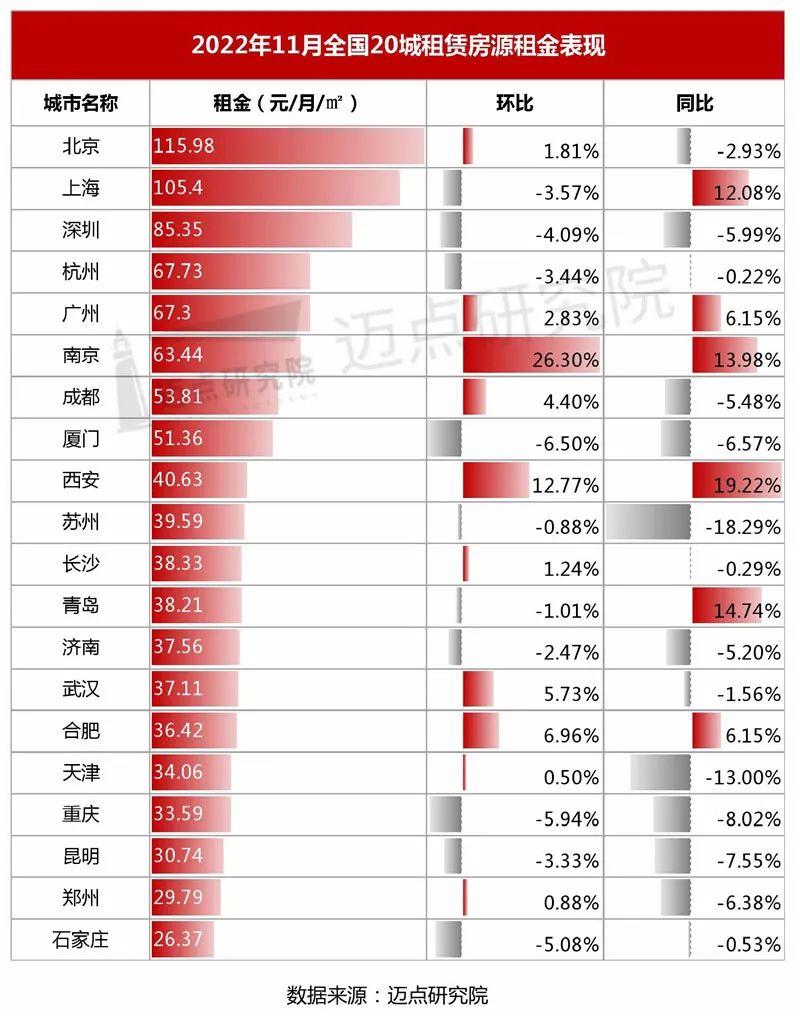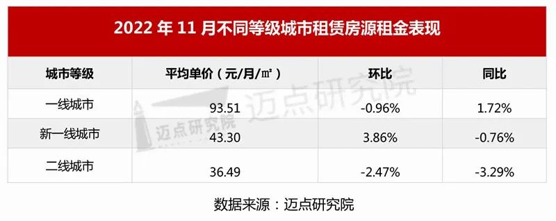 從不同線級城市的租金來看,2022年11月,受到租賃淡季的影響,一線、二線城市租金水平繼續(xù)下降,尤其是二線城市,下降幅度較大。