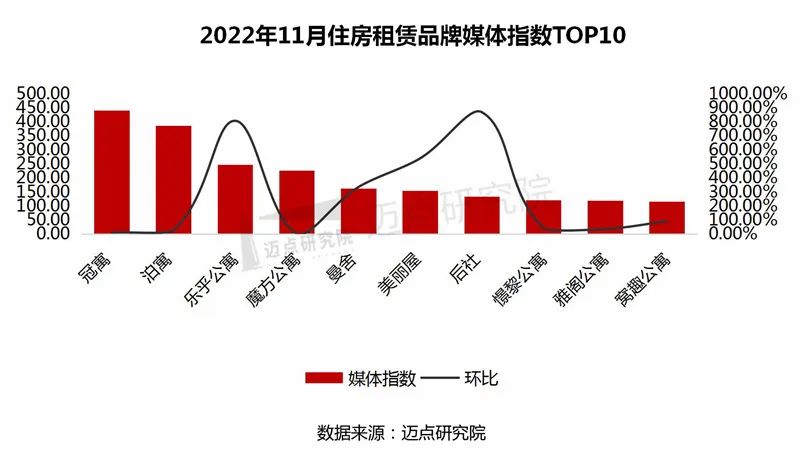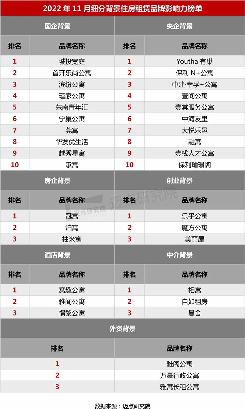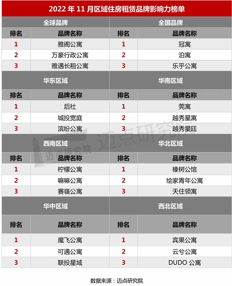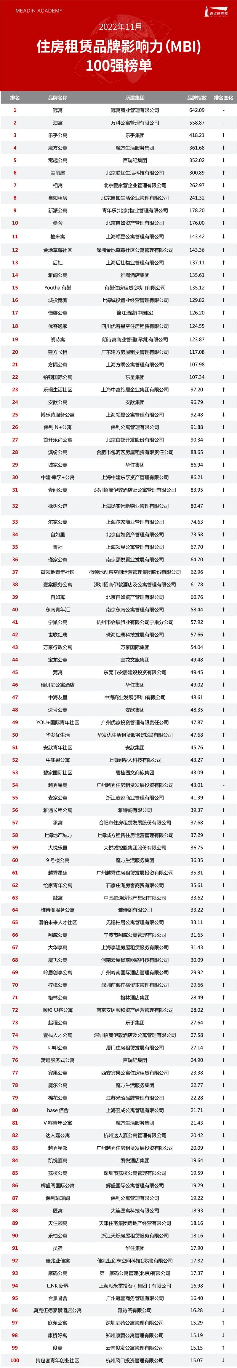 以下是邁點研究院獨家發(fā)布的“2022年11月住房租賃品牌影響力(MBI)100強榜單”。本月冠寓、泊寓、樂乎公寓、魔方公寓、窩趣公寓、美麗屋、相寓、自如租房、新派公寓、曼舍進入榜單前十。