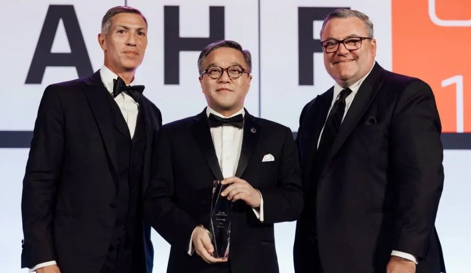 魯偉鼎代表萬向董事局主席魯冠球接受汽車名人堂的獎(jiǎng)杯 圖源:萬向集團(tuán)官網(wǎng)