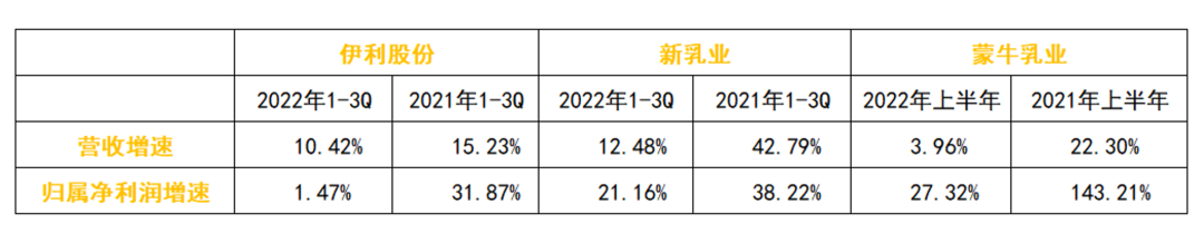 財報顯示,2022年前三季度,伊利股份(600887.SH)營收、歸母凈利潤同比分別增長10.42%、1.47%,新乳業(yè)(002946.SZ)營收、歸母凈利潤同比分別增長12.48%、21.16%;2022年上半年,蒙牛乳業(yè)(02319.HK)營收、歸母凈利潤同比分別增長3.96%、27.32%。相較去年同期,大家都還在進步,但步伐已明顯慢了下來。