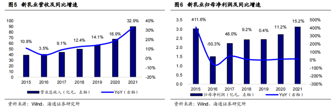 體現(xiàn)在個例上,就拿新希望旗下,風(fēng)頭正盛的新乳業(yè)來說,2017年-2021年,公司營收從44.22億元增長至89.67億元,歸屬凈利潤從2.22億元增長至3.12億元。