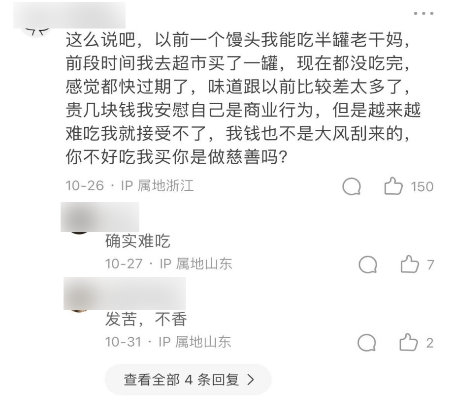 第二組評論的時間是今年10月份,皆是負(fù)面情緒:一是覺得現(xiàn)在的老干媽,味道和過去的沒法比。二是不僅沒法比,價格還漲了不少,拿消費者當(dāng)冤大頭。