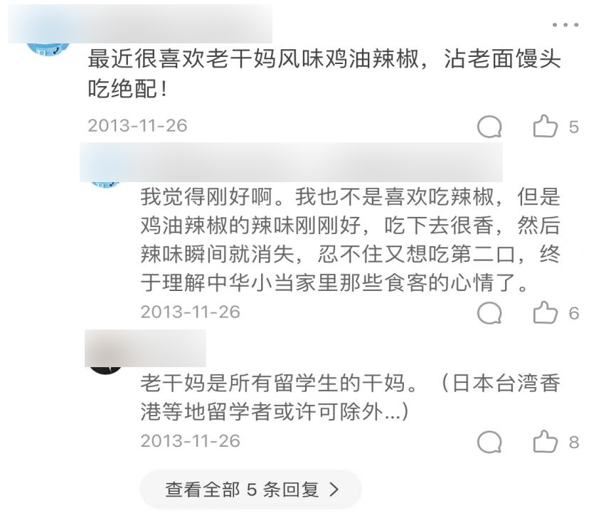 第一組評論的時間是2013年,當(dāng)時的老干媽在消費者中的口碑依然穩(wěn)固,蘸辣椒醬吃饅頭是那一代人普遍的回憶。