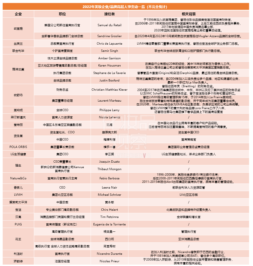 據(jù)化妝品觀察不完全統(tǒng)計,截至目前發(fā)生的跨國公司人事變動超過30起,其中既包括任命新的全球“一把手”,也有一些公司調(diào)整組織架構后創(chuàng)造出新的職位和晉升機會。有業(yè)內(nèi)人士感嘆,“今年大概是美妝行業(yè)人事變動最大的一年”。