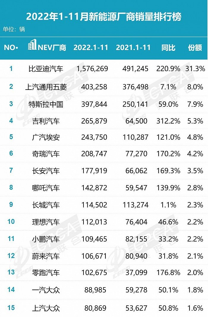2022年1-11月新能源廠商銷(xiāo)量排行榜,圖/乘聯(lián)會(huì)微信公眾號(hào)