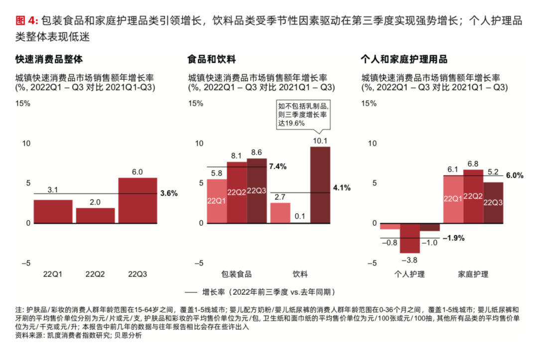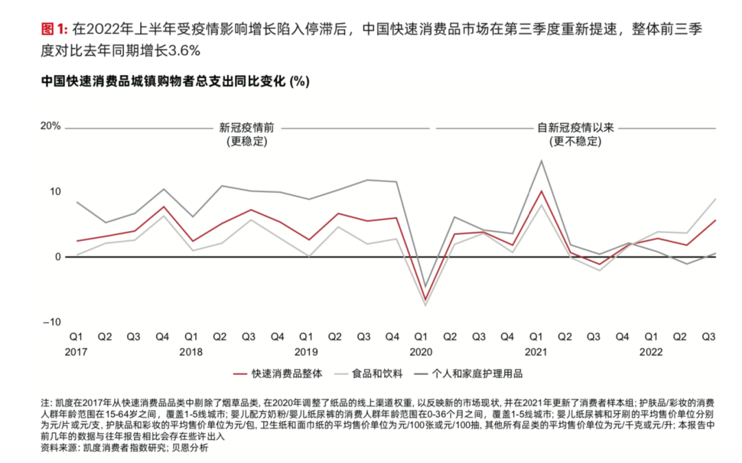 “今年前三季度,中國快消品市場有點(diǎn)像過山車一樣?!庇輬?jiān)在發(fā)布會上指出,一季度整個快消品市場表現(xiàn)不錯,但二季度受到疫情封控非常大的影響,進(jìn)入三季度又迅速強(qiáng)勢反彈??傮w來看,快消品市場依然表現(xiàn)出強(qiáng)勁韌性,2022年前三季度比去年同期增長3.6%,一舉扭轉(zhuǎn)2020年以來的一貫趨勢。