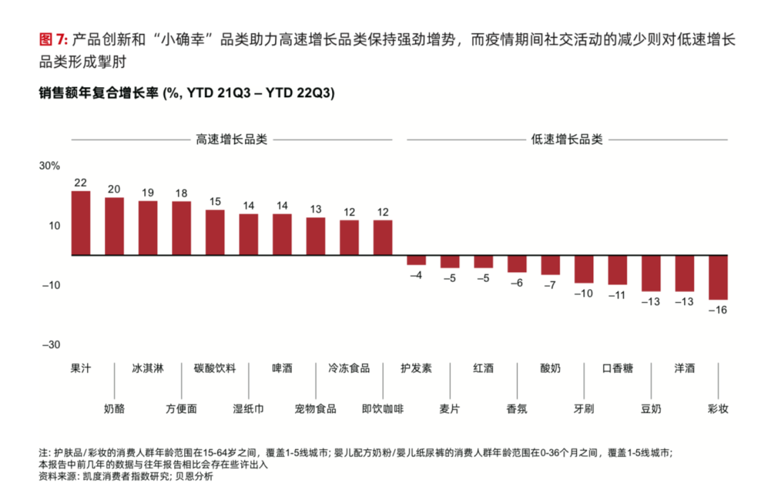 報(bào)告顯示,一方面,封控期間消費(fèi)者不得不宅在家中, 社交場景因此減少,進(jìn)而導(dǎo)致洋酒、葡萄酒和口香糖等品類銷售額增速放緩。另一方面,由于消費(fèi)者對部分產(chǎn)品的健康功效認(rèn)知不足,因此減少了非必需品的購買,如酸奶。