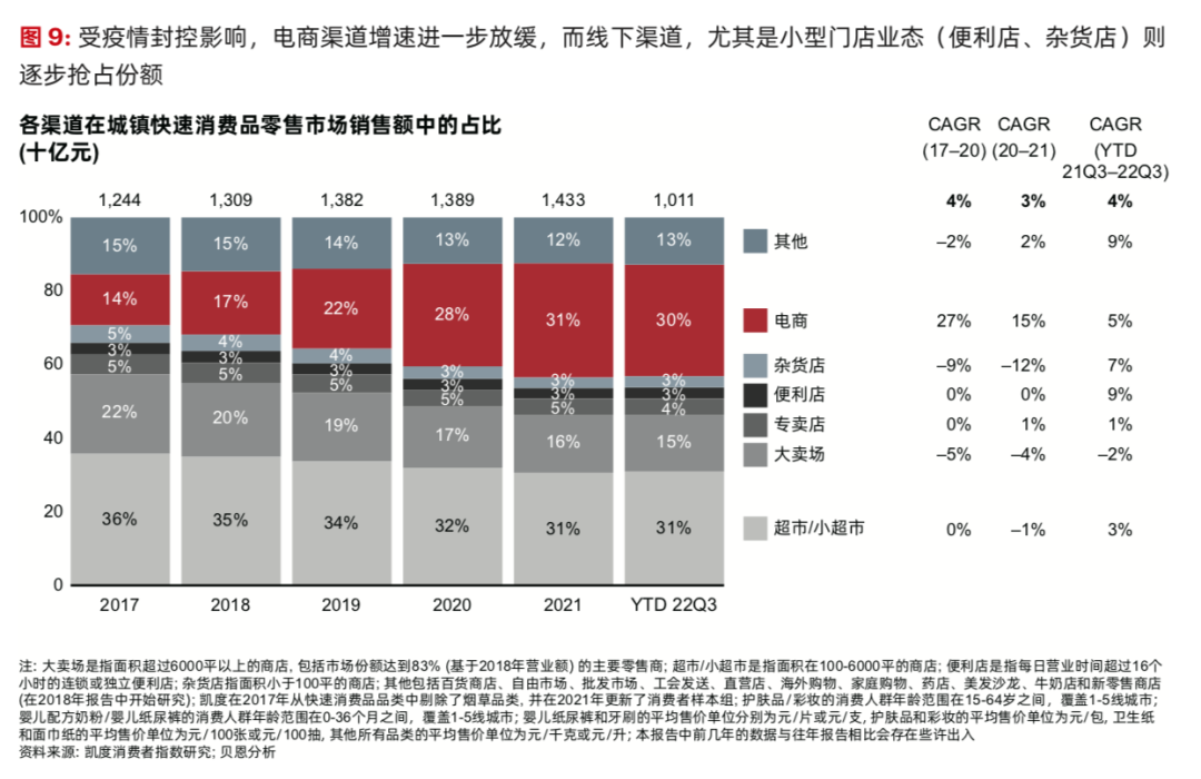在渠道方面,他指出,疫情影響也推動著渠道格局發(fā)生改變。2022年前三季度,電商渠道增速與快消品市場整體增速基本持平,而小型線下門店業(yè)態(tài)和O2O商業(yè)則在疫情之下乘勢而起。這主要是因?yàn)橄M(fèi)者渴望獲得即時滿足,同時又想避免純線上購物帶來的訂單履約問題,以及大賣場的密集人流和感染風(fēng)險(xiǎn)。