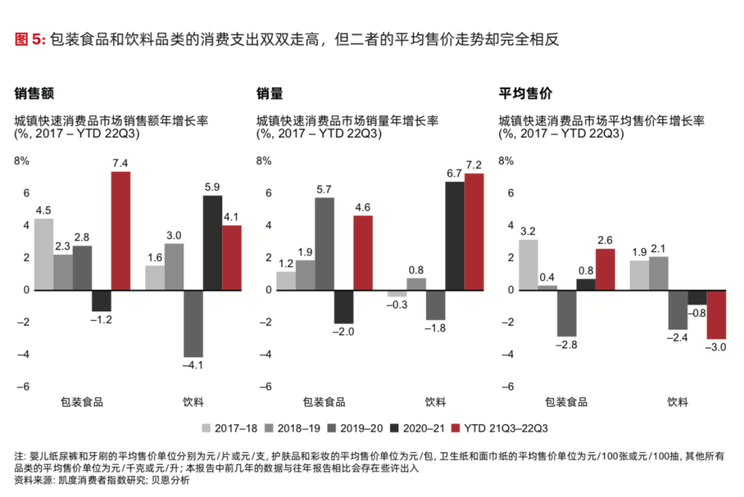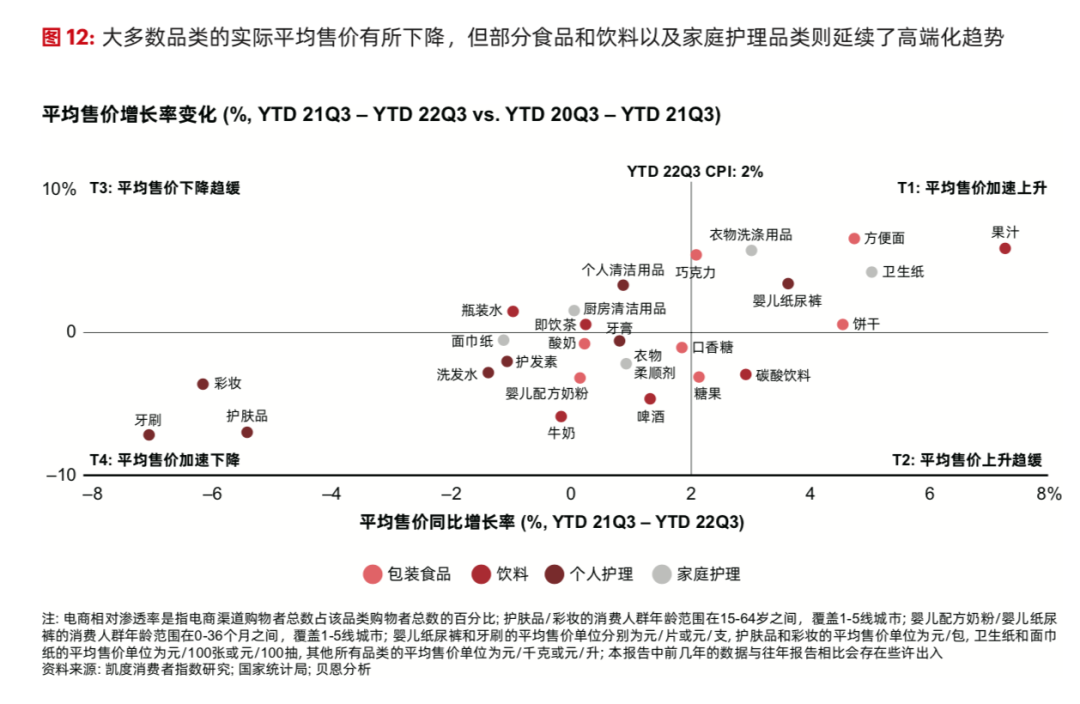 “僅少數(shù)品類的實(shí)際平均售價(jià)增幅高于通脹水平,且多為食品和飲料以及家庭護(hù)理品類?!眻?bào)告指出。比如我們上文提到,包裝食品平均售價(jià)上漲了2.6%,超過了通脹水平,背后就有延續(xù)了消費(fèi)升級/高端化趨勢的原因。