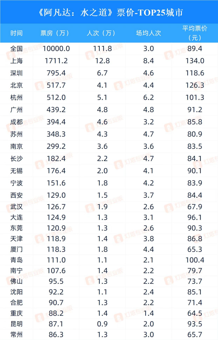 據(jù)燈塔專業(yè)版數(shù)據(jù)顯示,12月10日《阿凡達(dá):水之道》預(yù)售票房破億時(shí),其平均票價(jià)為89.4元,IMAX平均票價(jià)為126.2元。細(xì)分到城市當(dāng)中,可以看到,上海的平均票價(jià)達(dá)到了134元,斷層領(lǐng)先于第二名118.6元的深圳,平均票價(jià)突破三位數(shù)的城市僅有五個(gè)。