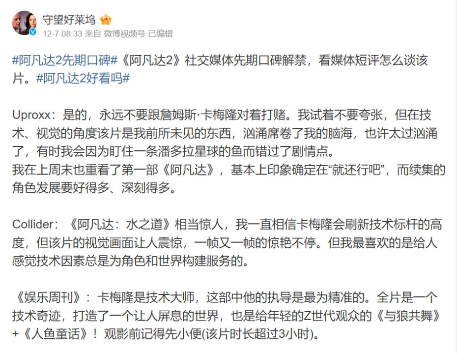 影片在國外先釋放了一波社交媒體口碑,但縱觀各家媒體的評價(jià),基本都圍繞著“刷新技術(shù)上限”的角度展開,而對故事閉口不談。包括詹姆斯·卡梅隆的采訪,結(jié)論也集中于“提供前所未有的沉浸式體驗(yàn)”。