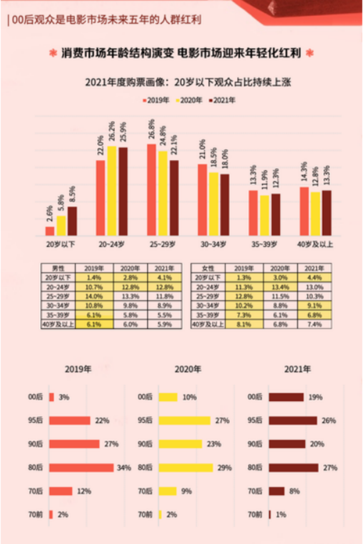 根據(jù)貓眼研究院《2021中國電影市場數(shù)據(jù)洞察》顯示,中國電影市場占比最高的觀眾群為20-24歲,24歲以下觀眾占比正在逐年提升,而24歲以上觀眾占比在逐年下滑或維持不變。2021年,00后觀眾甚至就已經(jīng)占到了接近20%的比重。