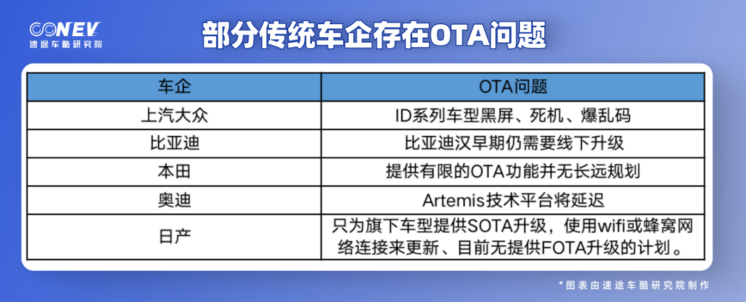 除此之外,我們細細數(shù)來,傳統(tǒng)車企在OTA升級過程中還存在從思維文化,到底層架構、軟件開發(fā)、功能設計,再到用戶運營等多方面的問題,“大象轉身”著實不易。