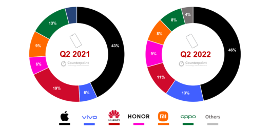 比如小米、OPPO、vivo均發(fā)布了面向特定功能的自研芯片;小米、OPPO、vivo、榮耀均推出了折疊屏系列;手機(jī)廠商和各大經(jīng)典相機(jī)合作等等。根據(jù)Counterpoint Research銷量報(bào)告顯示,2022年第二季度, 中國高端智能手機(jī)市場(chǎng)銷量份額前六位分別為蘋果、vivo、華為、榮耀、小米、OPPO,市場(chǎng)銷量份額分別為46%、13%、11%、9%、8%、8%。