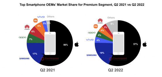 即便如此,榮耀再次出海也沒那么順利。根據(jù)Counterpoint Research銷量報(bào)告顯示,2022年第二季度,全球高端智能手機(jī)市場(chǎng)份額前6分別是蘋果、三星、vivo、oppo、小米、華為,市場(chǎng)份額分別為57%、19%、4%、4%、4%、3%,而榮耀被并入“其它”。雖然國內(nèi)高端手機(jī)市占率排名第4,全球高端手機(jī)TOP6榜單,榮耀還未躋身挺進(jìn)。