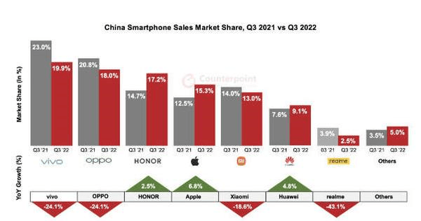 雖然當(dāng)時(shí)很多人并不不看好榮耀獨(dú)立發(fā)展,但低迷并沒有持續(xù)太長時(shí)間,2021年7月底,榮耀的市場(chǎng)份額來到14.6%。今年前三季度,在國內(nèi)市場(chǎng)手機(jī)總體出貨量累計(jì)1.96億部,同比下降21.1%的情況下,根據(jù)Counterpart的最新報(bào)告,2022年第三季度榮耀在中國智能手機(jī)市場(chǎng)的占有率為17.2%,較去年同期提高2.5%,排名第三,僅次于vivo、oppo。