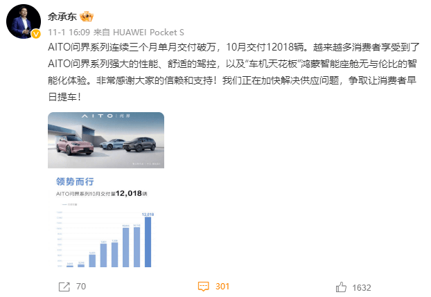 另一類是華為、榮耀這樣當(dāng)“供應(yīng)商”的;與問界的合作,車型可以在華為門店銷售,余承東更是為問界各種站臺(tái)宣傳,不少人甚至以為這是華為在造車,效果也十分顯著——8、9、10月單月交付破萬。