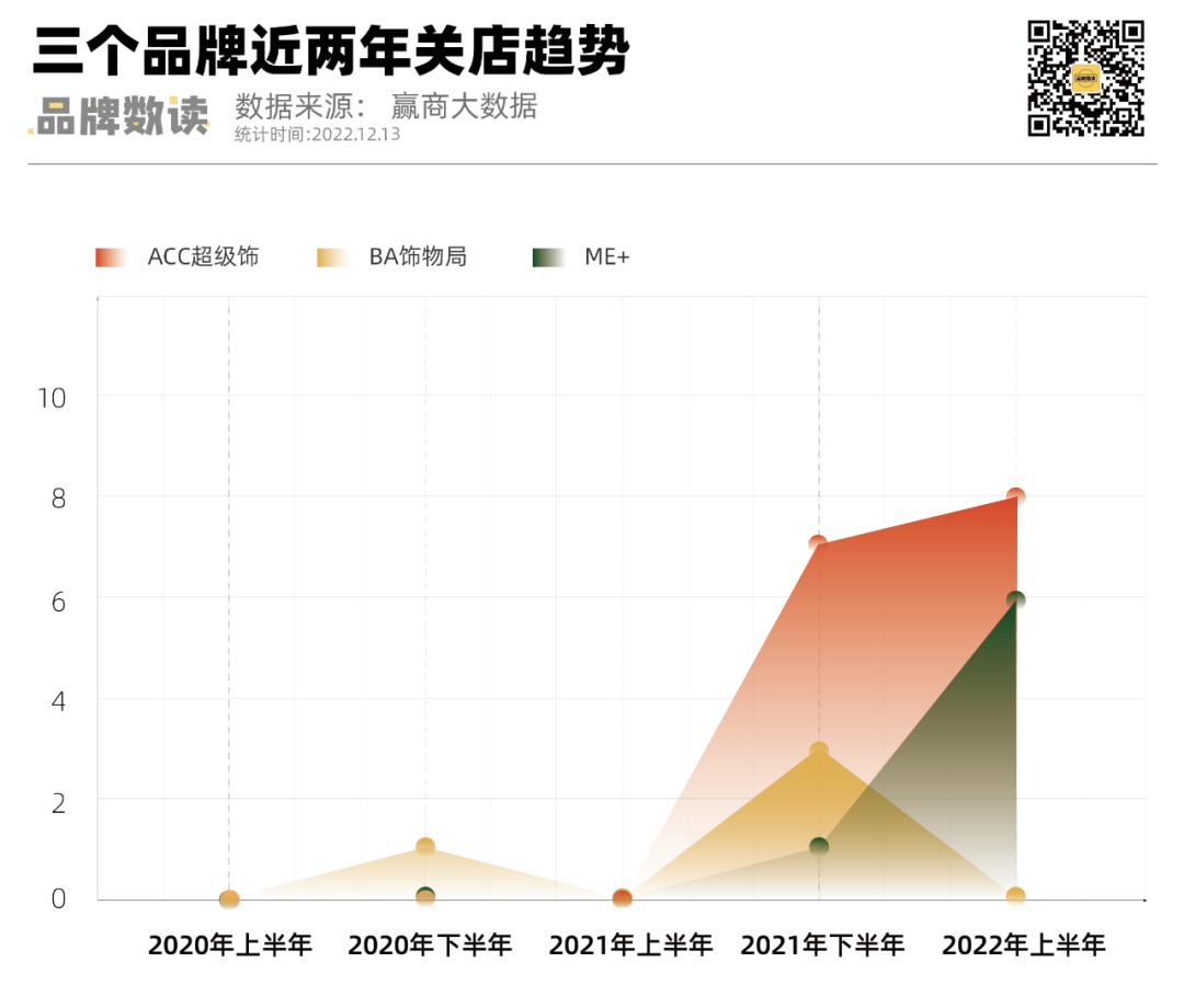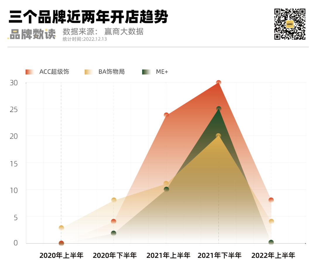 如今低調(diào)關(guān)店,不僅是單個品牌的撤退,而是一場集體撤退。從節(jié)點上看,這一賽道的代表品牌ACC超級飾、BA飾物局、ME+飾品上一次大規(guī)模開店均是在2021年第四季度,且官宣門店數(shù)都是一批,而最新的門店都是在今年6月,官宣的門店只有個位數(shù)。