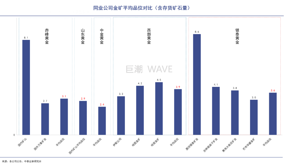 2021年,銀泰黃金合質(zhì)金產(chǎn)量為7.2噸, 僅排在同行業(yè)上市公司中的第五位,但其礦產(chǎn)品位高,利潤好。銀泰黃金整體礦山平均品位為3.6克/噸,僅略微次于西部黃金,旗下黑河銀泰金礦平均品位高達(dá)8.6克/噸,是行業(yè)中的最高水平。