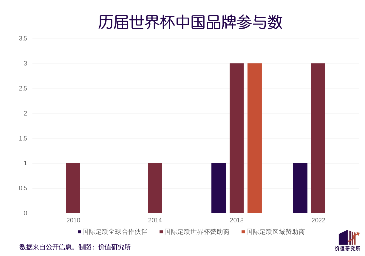 也是在英利完成開荒之后,2018年俄羅斯世界杯中國企業(yè)成為國際足聯(lián)最重要的合作伙伴,共有萬達、海信、蒙牛、vivo、雅迪、指點藝境和帝牌六個品牌成為官方贊助商,其中萬達為等級最高的國際足聯(lián)全球合作伙伴。