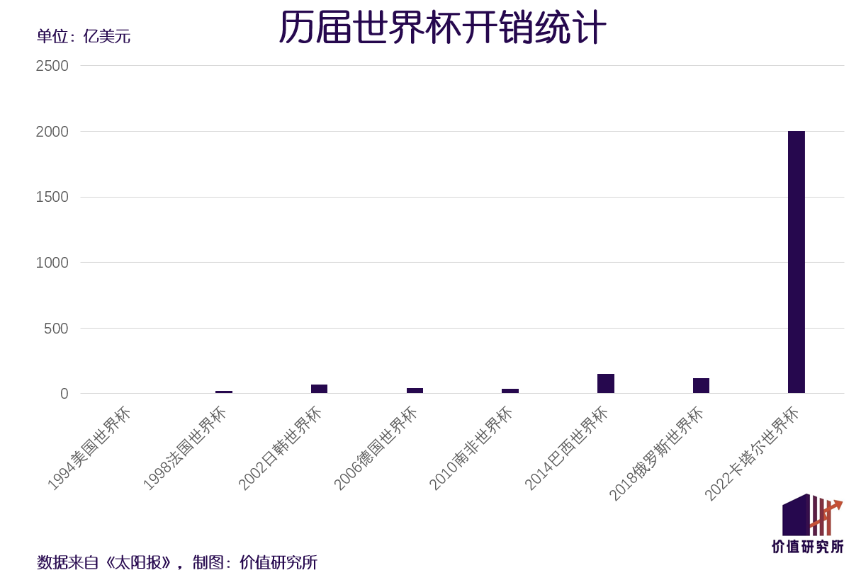 今年9月,英國《太陽報》為世界杯算了一筆賬:1994年美國世界杯主辦方開銷總額為5億美元,4年后的法國世界杯飆升至23億美元,再往后的幾屆分別為70億、43億、36億、150億和116億美元。到了2022年世界杯,官方公布的總開支高達2000億美元。