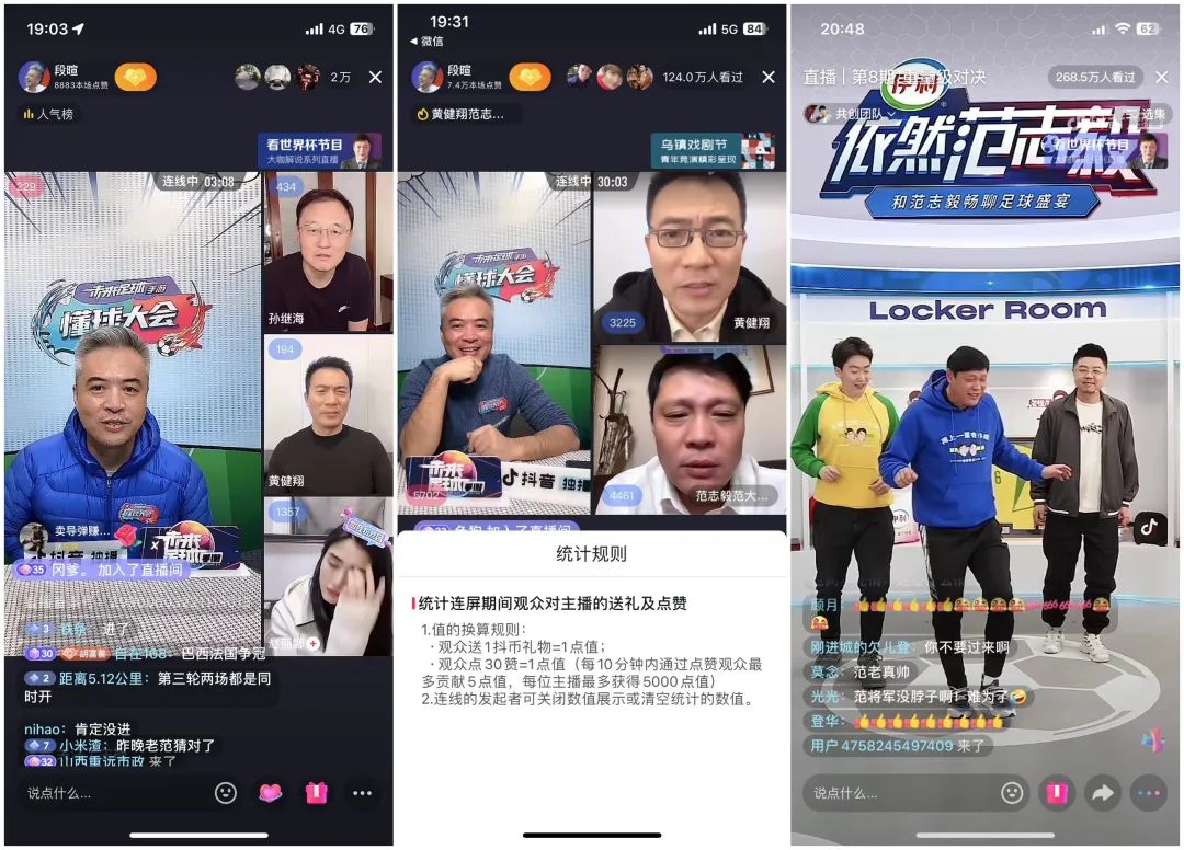 在大咖解說方面原央視明星級解說黃健翔、劉建宏、段暄、張路為主配合前國腳孫繼海、范志毅等,在自制節(jié)目方面,上線《依然范志毅》《黃健翔談》等 7 款綜藝欄目,而在明星入駐方面據(jù)官方披露邀請到了內(nèi)馬爾、貝克漢姆、邁克爾歐文等,抖音還開設(shè)了抖音體育、抖音世界杯等多個官方賬號進行新聞式播報。