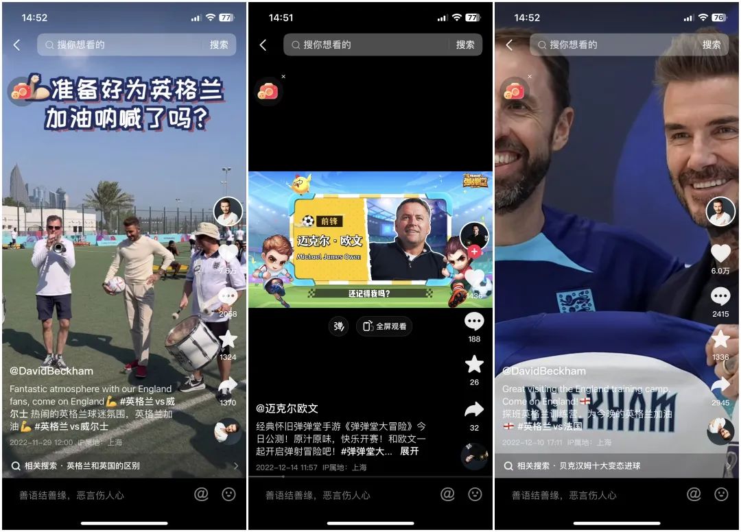 貝克漢姆的短視頻內(nèi)容,幾乎全部來自于其他視頻剪輯,原創(chuàng)視頻極少,更無法談及平臺專屬內(nèi)容。前英格蘭國腳邁克爾歐文作為此次抖音世界杯期間最為賣力的體育明星,其短視頻更新數(shù)量非常之多,但內(nèi)容卻與世界杯關(guān)聯(lián)度非常弱,從帶貨小游戲,到接龍?zhí)魬?zhàn),來到抖音之后幾乎沒想要“久留”,賬號的打法與用心沉淀粉絲關(guān)系不大。另一些足球體育明星,羅納爾多、內(nèi)馬爾等幾乎都在世界杯期間停更。