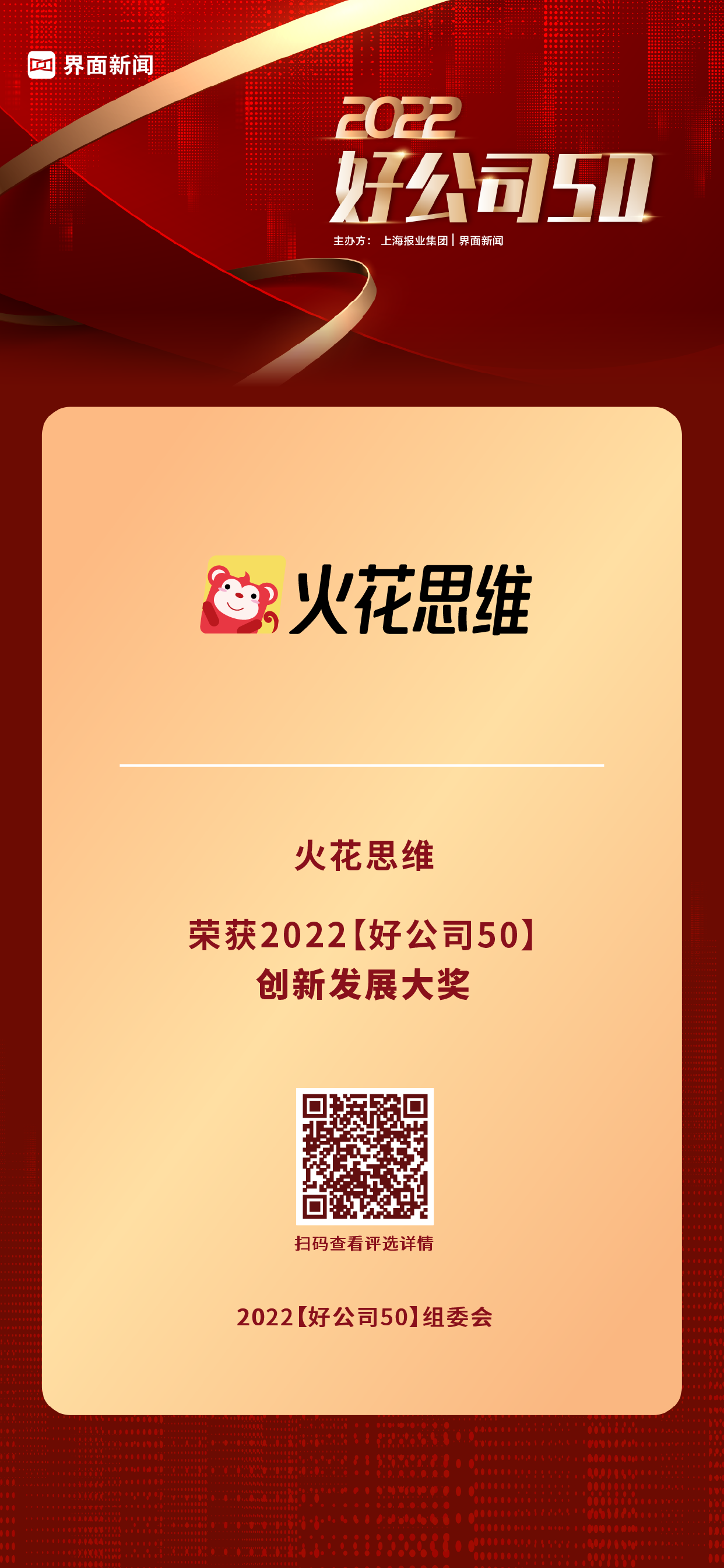 12月20日,上海報業(yè)集團|界面新聞在上海中心舉辦了【2022好公司50】頒獎典禮,正式公布了本年度的獲獎名單。評選自今年7月正式啟動申報以來,來自39個細分行業(yè)的500余家候選公司,經(jīng)過近半年的大眾投票、市場表現(xiàn)、創(chuàng)新活力、公司治理、社會聲譽等方面的角逐,最終50家優(yōu)質(zhì)企業(yè)突破重圍榮登年度榮譽榜單。火花思維,用科技為教育賦能,以創(chuàng)新技術(shù)驅(qū)動教育創(chuàng)新,專注青少年邏輯思維在線教育,榮膺【2022好公司50——創(chuàng)新發(fā)展大獎】。