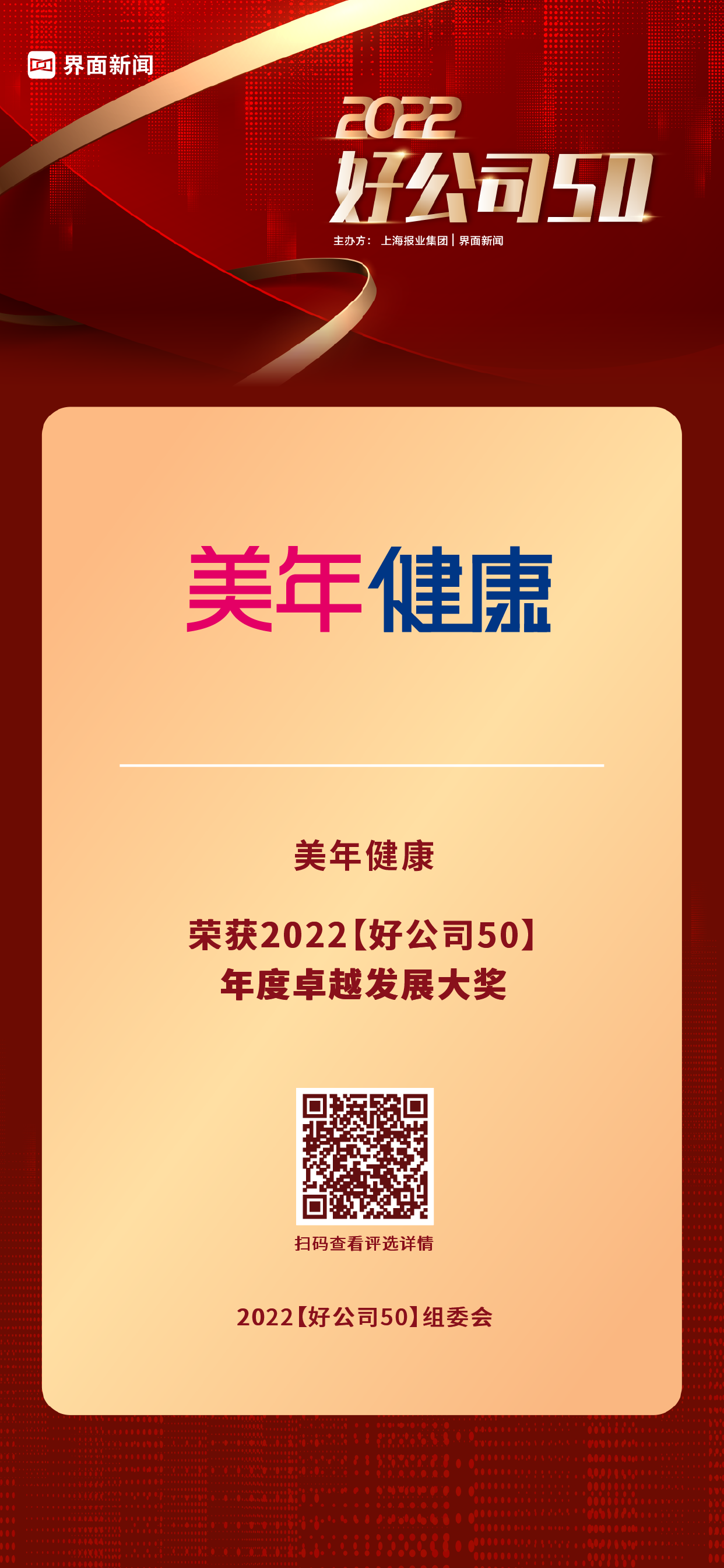 12月20日,上海報業(yè)集團|界面新聞在上海中心舉辦了【2022好公司50】頒獎典禮,正式公布了本年度的獲獎名單。評選自今年7月正式啟動申報以來,來自39個細分行業(yè)的500余家候選公司,經(jīng)過近半年的大眾投票、市場表現(xiàn)、創(chuàng)新活力、公司治理、社會聲譽等方面的角逐,最終50家優(yōu)質(zhì)企業(yè)突破重圍榮登年度榮譽榜單。其中,美年健康(002044.SZ)憑借在中國預(yù)防醫(yī)學(xué)領(lǐng)域的持續(xù)精細化運營、創(chuàng)新發(fā)展和數(shù)字化升級榮膺【2022好公司50——卓越發(fā)展大獎】。