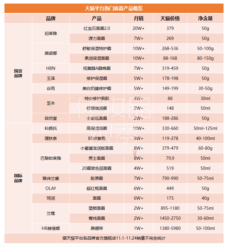 不過,化妝品觀察統(tǒng)計天貓平臺熱銷的相關面霜產(chǎn)品數(shù)據(jù)后,發(fā)現(xiàn)面霜品類的各類玩家已形成新的發(fā)展格局。