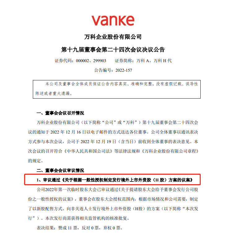 12月20日,萬(wàn)科A公告稱,公司董事會(huì)制定了擬以新股配售方式、向非關(guān)連人士發(fā)行境外上市外資股(H股)的方案。