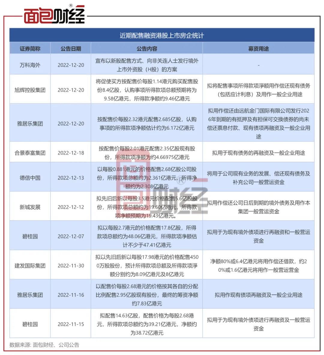 值得關(guān)注的是,在支持房企融資的多重政策利好下,包括旭輝控股集團(tuán)、新城發(fā)展在內(nèi),近期多家港股房企已陸續(xù)宣布配售融資。其中,碧桂園、雅居樂(lè)更是拋出二輪配售融資計(jì)劃。從募集資金用途來(lái)看,大多房企指向了補(bǔ)充流動(dòng)資金及償還債務(wù)。