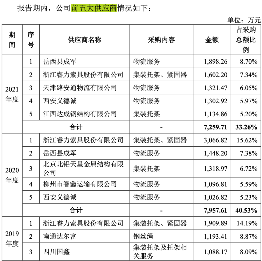 《招股書》顯示,報告期內(nèi)(下指2019-2021年),在2019、2020年,浙江睿力是睿澤科技的最大供應(yīng)商,主要為睿澤科技提供集裝托架、緊固器,占采購總額的比例分別為14.19%、15.62%。2021年,睿澤科技對浙江睿力的采購占比有所下降,但浙江睿力也以7.34%的比例位列第二大供應(yīng)商。