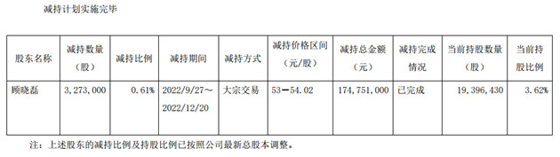 顧曉磊的上述股份減持計劃于2022年9月22日披露,即自減持計劃公告之日起的3個交易日后的3個月內(nèi),通過大宗交易的方式減持不超過327.30萬股(不超過公司當(dāng)時總股本的0.61%)。
