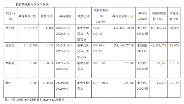 2022年5月至6月間,馮宇霞、周志文合計減持683.23萬股,合計套現(xiàn)6.95億元。