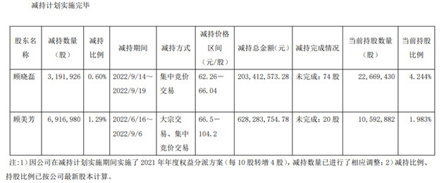 2022年6月至9月間,顧曉磊、顧美芳合計減持1010.89萬股,合計套現(xiàn)8.32億元。