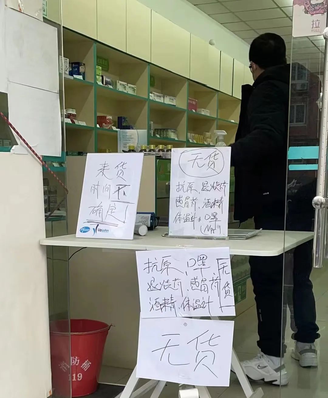 那時,感染還沒有大面積擴散,但藥品已出現(xiàn)供應緊張的情況。8家藥店像約好了一般,在玻璃門上貼著一樣的A4紙,上面寫著“沒有抗原、布洛芬、連花清瘟”。