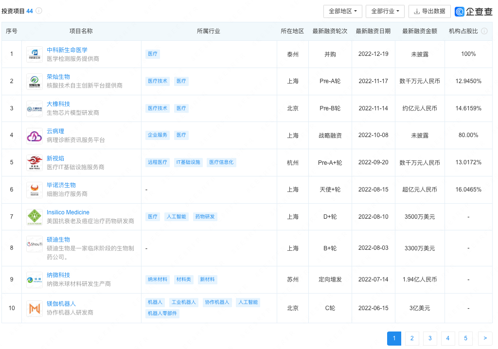 對于“醫(yī)藥界阿里”這個說法,李革并不反對。在他看來,阿里大幅降低了個體業(yè)主成為商業(yè)擁有者的門檻,而藥明康德要做的是大幅降低科學(xué)家發(fā)現(xiàn)新藥的門檻。因此,藥明康德的投資業(yè)務(wù)十分廣泛。企查查顯示,其投資項(xiàng)目共44個,從天使輪到IPO輪次均有。