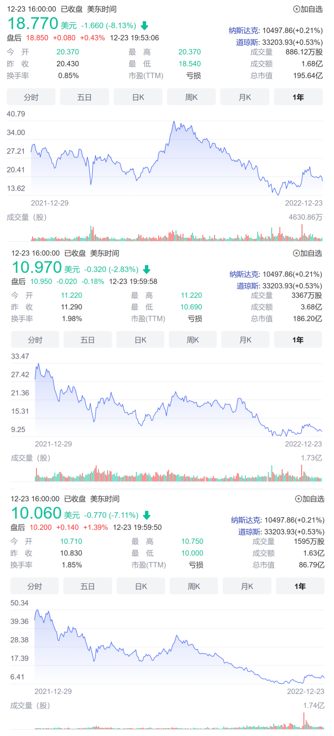 自上而下分別為:理想、蔚來(lái)、小鵬一年來(lái)美股股價(jià)走勢(shì)